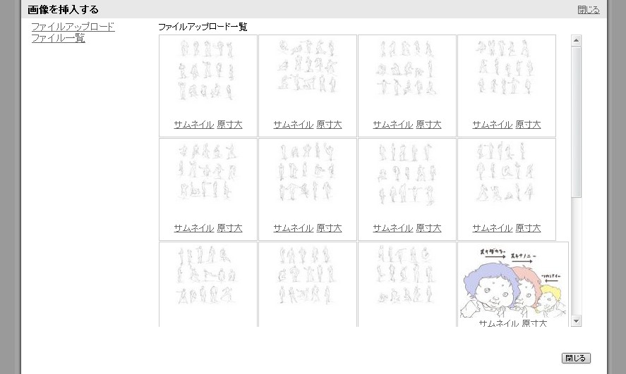 そして一つの画像を選択したら、また記事に戻って画像ボタン→ファイルアップロードか一覧から選択→画像選択と3ステップも踏まなきゃいけないのも難点。
